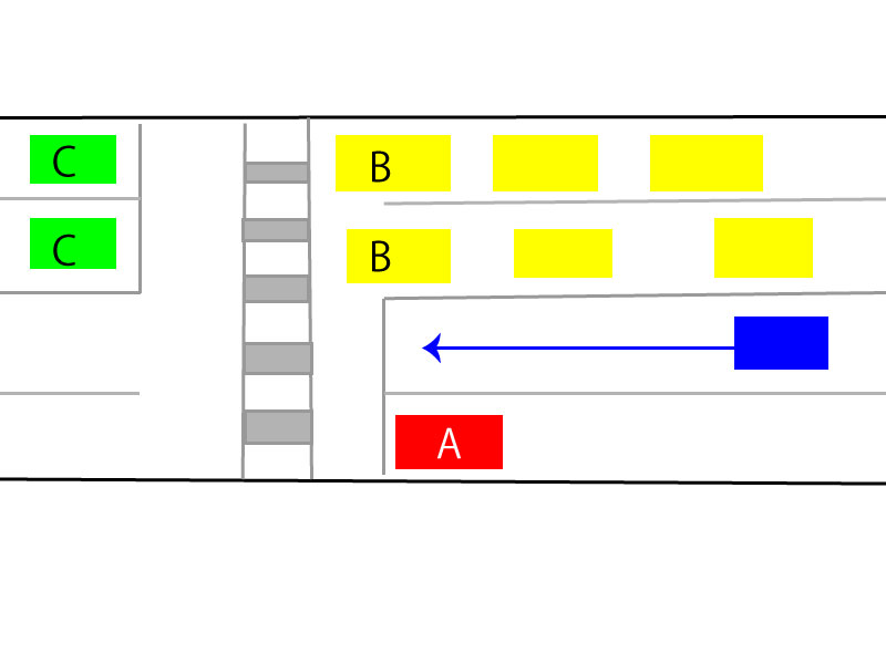 上の図のような場合は横断歩道直前まで歩行者の存在が見えませんので、当然横断歩道手前で停止できる速度で進行する義務があり、見通しなどの状況に応じ、一時停止をして確認する必要がある場面もあるかと思います。